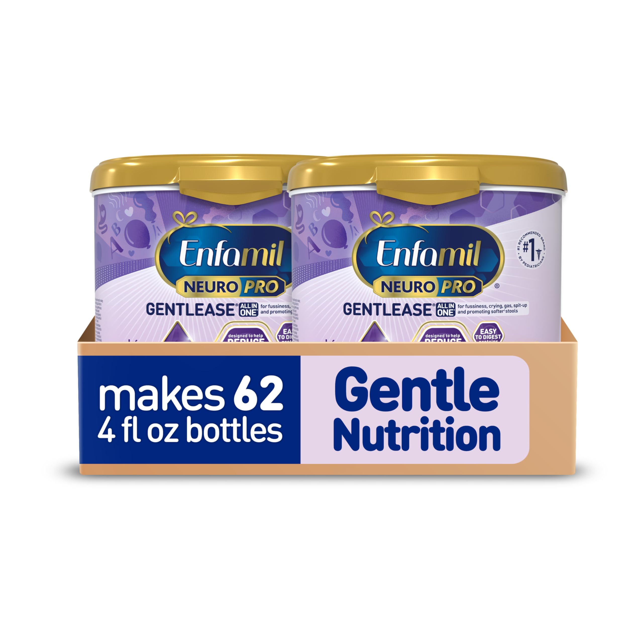 Enfamil NeuroPro Gentlease offers all-in-one comfort that quickly soothes fussiness, gas, and spit-up within just 24 hours.